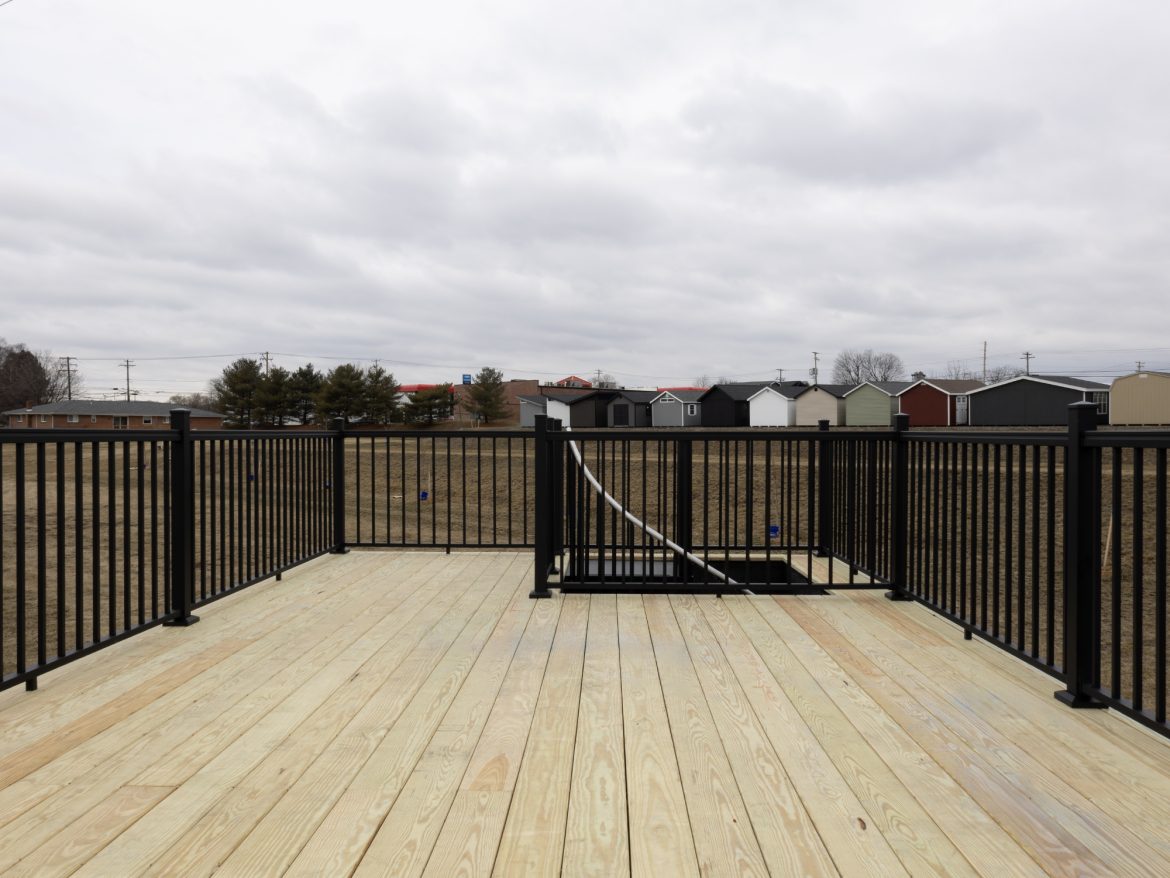 The rooftop deck is installed with aluminum railings that are not only good looking but also a safety feature, and the porch has pressure-treated wood decking and vertical 1×6 tongue-and-groove cedar boards (with V-groove detailing and clearcoat finish) on walls and ceiling.