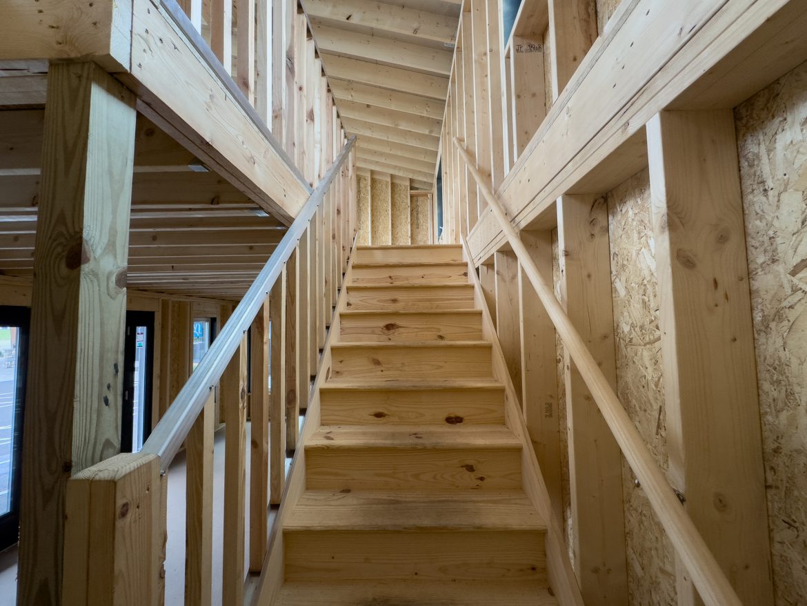 - Interior access through 36-inch corner stairs with a landing and safety railing made out of rough wood.