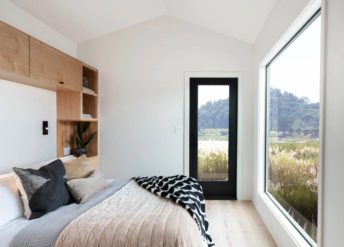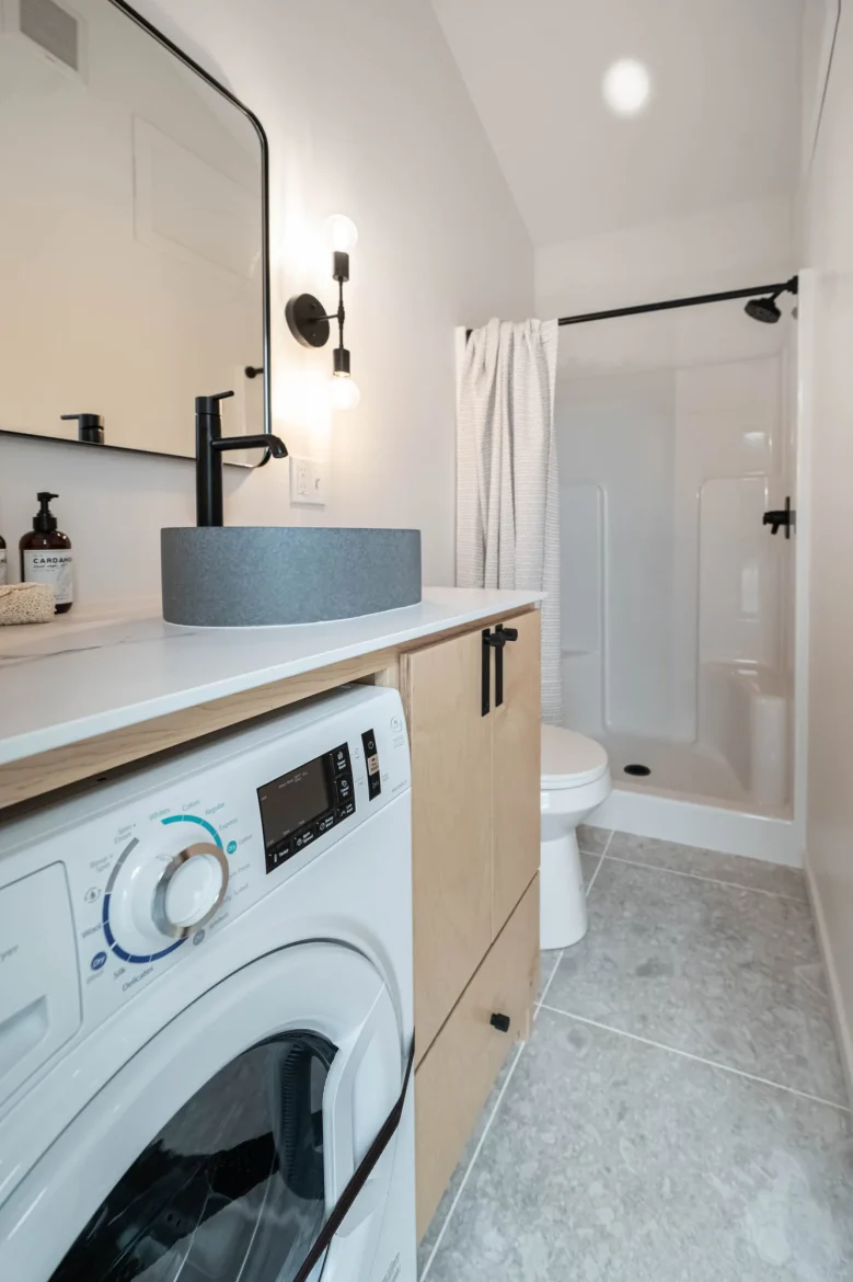 The same level of care is evident in the bathroom, the place where practicality and luxury are combined expertly. Concrete vessel sinks, terrazzo tile floors and matte black bathroom fixtures help make this bathroom a market-leading spa-like experience that differentiates Truform Tiny from other builders.
