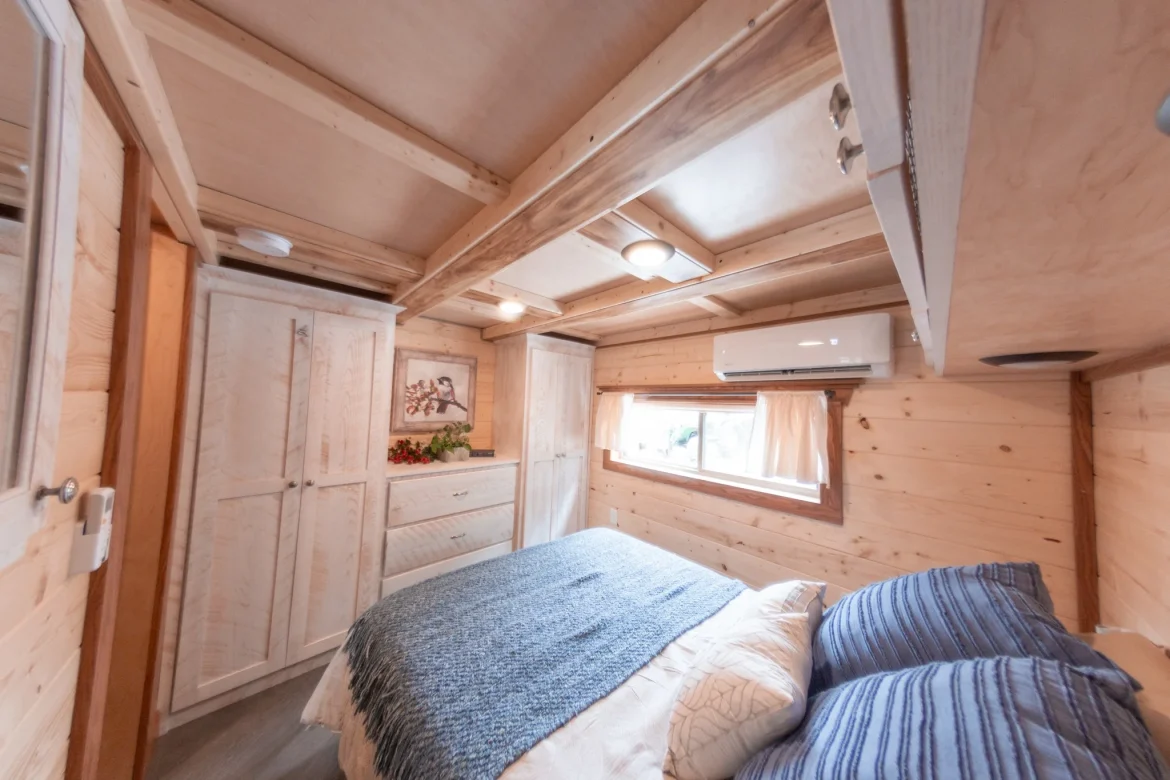 A breathtaking handcrafted stairway leads to the loft bedroom, which is the open, liveable space upstairs. The height of the loft is 5 feet, which gives plenty of space to sit up in bed comfortably, and at the same time it is big enough for a king-size bed. Storage options are double built-in dresser and entertainment station, the big window and lighting are used to create a small retreat ambiance. To make it easier to move furniture upstairs, one can install a simple railing or even a full loft door.