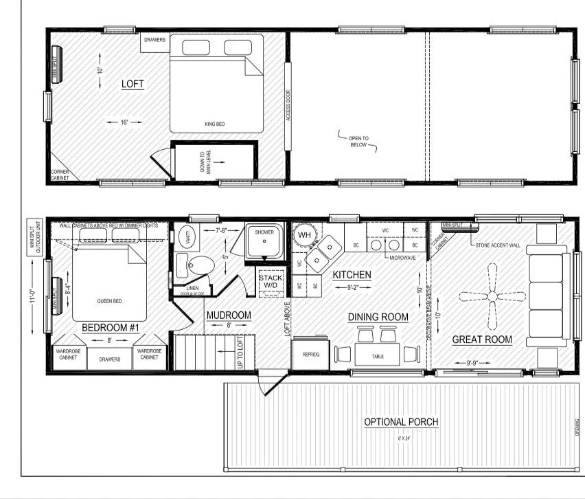 - Overall Size: 11 ft x 36 ft indoor living space plus 6 ft x 36 ft outdoor covered porch
