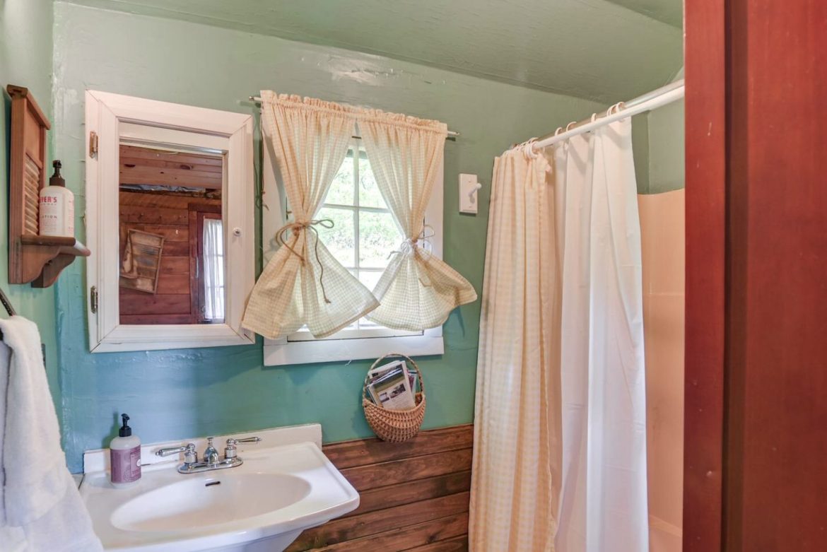 The full bathroom has gone through a facelift with modern fixtures and still has rustic touches: a deep soaking tub or a roomy shower (depending on the configuration), pedestal or vessel sink, and a lot of towels. A half-bath is there for the convenience of a large group. A washer and a dryer are kept out of sight, as a reminder that, even in a historic cabin, life goes on as usual.